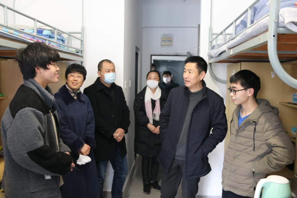 戴月波一行深入学生宿舍,与留校学子亲切交流,详细了解每一位留校学生寒假留校期间学习、生活、学生家庭所在地目前疫情等各方面情况,并询问了毕业年级学生目前的就业情况,希望大家作为新时代青年,能够与国家发展相同步,多寻找实现自我价值和社会价值的机会。同学们表示,学校、学院的各项工作都做得很贴心,高低年级同住一起也可以相互交流与帮助,目前不存在任何困难。戴月波代表学校,将精心准备的新年礼物交到学生手中,衷心祝福学生在校能够快乐、安心过年。