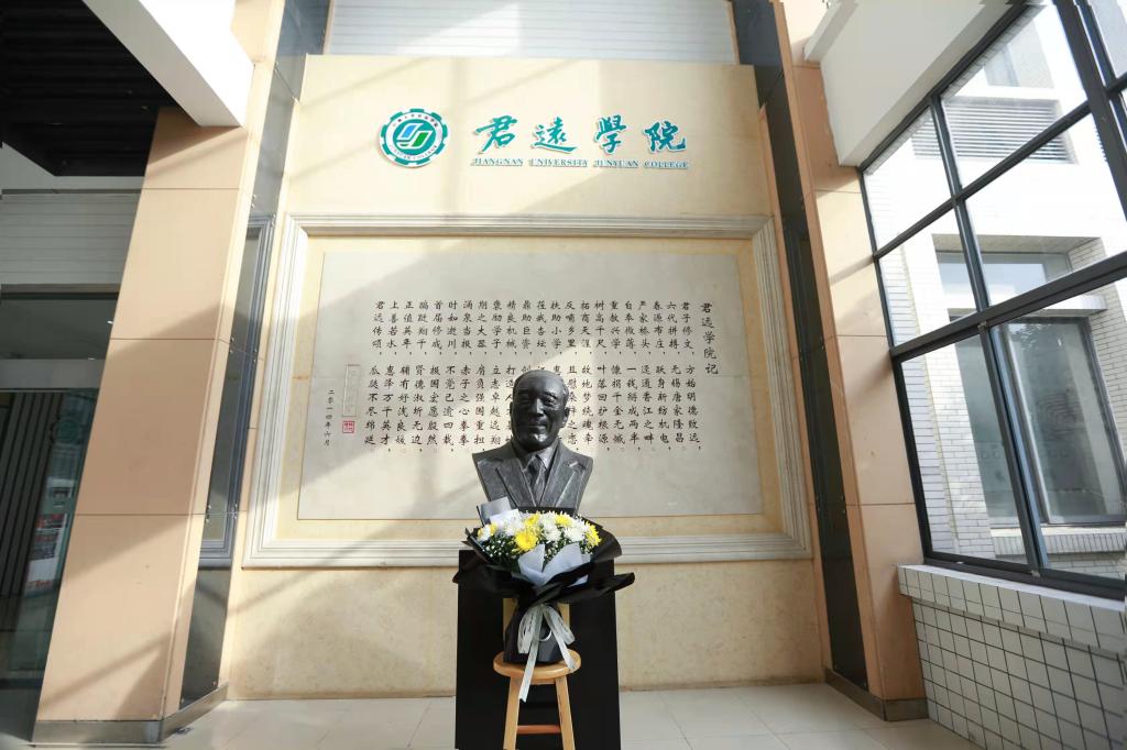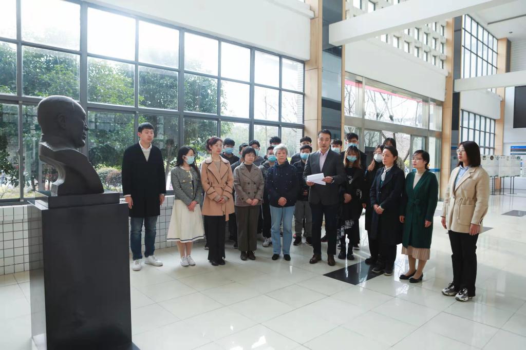 君远学院学生林丽英、彭默雷代表莘莘学子敬献鲜花,李可带领全体师生在塑像前三鞠躬默哀,再次表达对唐翔千先生的深切缅怀。