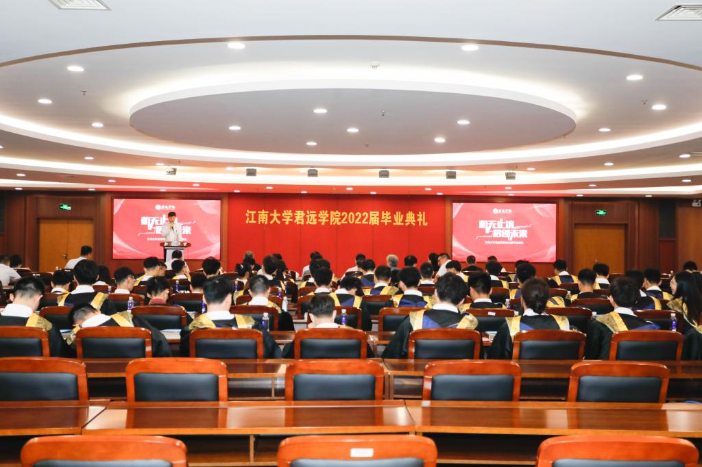 6月16日上午,冰球突破mg正规官网君远学院2022届毕业典礼在我校图书馆五楼报告厅举行。无锡市委统战部副部长、侨办主任、君远学院理事会理事赵俊明,上海唐君远教育基金会理事、原冰球突破mg正规官网副校长王武,上海唐君远教育基金会理事唐建年,冰球突破mg正规官网党委常委、副校长、君远学院理事会理事长堵国成,校党委常委、宣传部部长倪松涛,学生工作部部长张菁燕,教务处处长徐学明,招生就业处处长赵建新,社会资源处处长黄敏,党委统战部副部长王冰等领导和嘉宾,以及冰球突破mg正规官网、君远学院班子成员和部分教师代表参加了典礼仪式。学院辅导员高鑫主持仪式。
