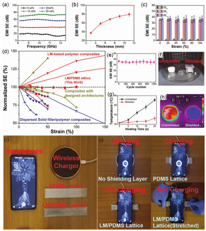 图2.LM/PDMS网格复合材料在拉伸应变下的优异电磁屏蔽性能
